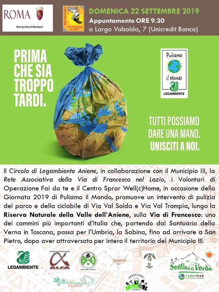 Oltre naturalmente al Circolo Legambiente Aniene Roma hanno aderito i volontari di Operazione “Fai da te“, che da anni quotidianamente puliscono il tratto, la Rete Associativa della Via di Francesco nel Lazio, Sentiero Verde – Federtrek, il Centro Sprar WELL-c-HOME, che per l’occasione preparerà anche una piccola merenda, l’Organizzazione Alfa, l’Associazione cinofilo ambientalista Non solo Cani, Spazio 4, Fronte dell’orto ONLUS, il Comitato di Quartiere “Sacco Pastore-Espero” e il Circolo ippico il Ranch.